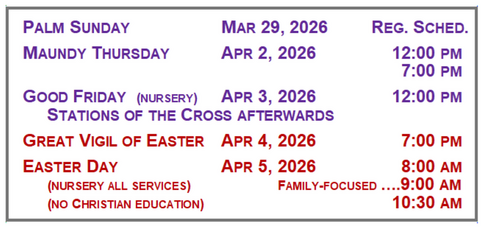 Mon-Fri, 9:00am (Holy Eucharist on Wednesday and Thursday)